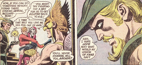 During the fight, the heroes team up and, unlikely though it may seem, Green Arrow actually asks to be teamed up with Hawkman. Of course, that doesn't stop him getting a few barbs in: