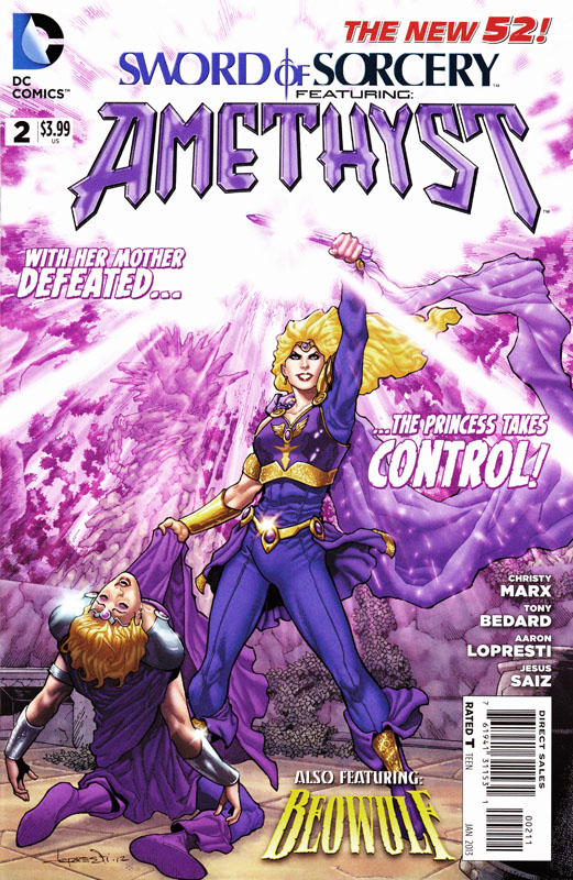 SWORD OF SORCERY #2 - Amy and her mother learn a bit more about what's been happening since they left Gemworld while inter-family arguments in the other houses stir up trouble and Amy's aunt hires some assassins. There's a lot going on featuring a lot of characters in different houses, all with odd names. If you're used to reading big fantasy novels, you probably won't find that a problem; for me, it's a little confusing, I have to admit. The Beowulf back-up continues to intrigue with its habit of throwing in references to current DCU characters while being in a setting that is clearly either a post-apocalyptic future or an alternate Earth.